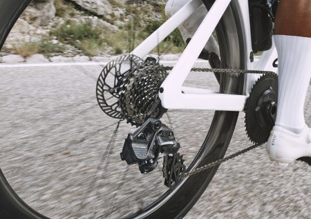 SUPER RECORD 13プラットフォームでは、SUPER RECORD X リアディレイラーは1×ロード用クランクセットと組み合わせることも可能で、45.8mmのロード用チェーンラインにも対応。現在市販されているなかで、最も幅広いギア比を備えたシングルチェーンリングロードバイクを実現します。