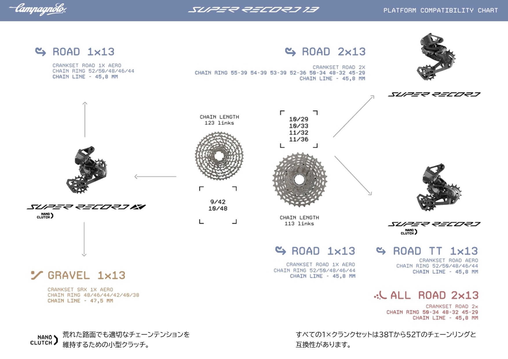 ロード用の2×13従来タイプリアディレイラーに加え、SUPER RECORD X リアディレイラーに搭載されているナノクラッチ付の13スピード用リアディレイラーもラインナップされます。