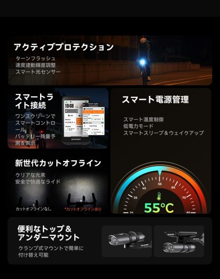 最大輝度1800ルーメンの明るさを生かすため、安全性に配慮した配光を併せ持ち、サイクルコンピュータとの連動によりさまざまな高機能を可能にしています。