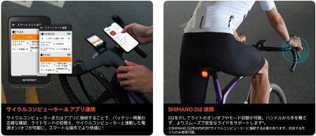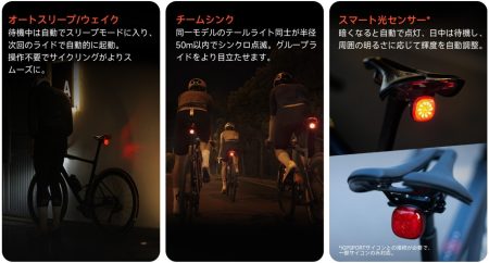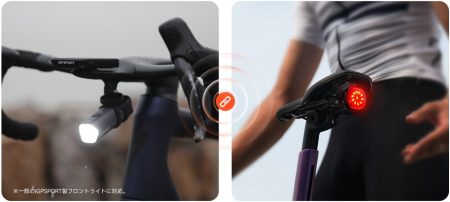 フロントライトとテールライトが近くにあると自動的に接続し、ワンタッチで同時にオン/オフが可能。