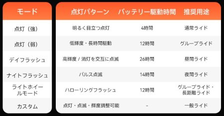 ライトホイール、フラッシュ、点灯など合計6つのモードに対応。
