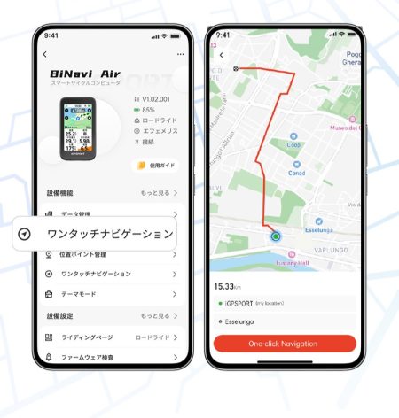 3.0インチディスプレイ採用。iGPSPORTを代表するモデルとなった「BiNavi」の大画面コンセプトはキープしつつ、ダウンサイジングと軽量化を果たし、お求めやすい価格も実現したニューモデルが「BiNavi Air」です。
